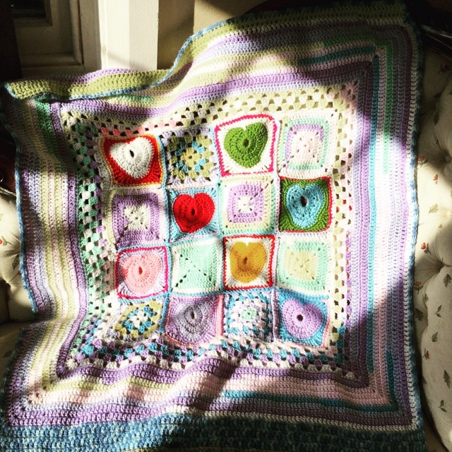 This is my granny square hearts love blanket. It’s not a big blanket, but will serve as a cuddly lap blanket to keep you warm in the coming winter months in Sydney. It’s great to watch TV in too!