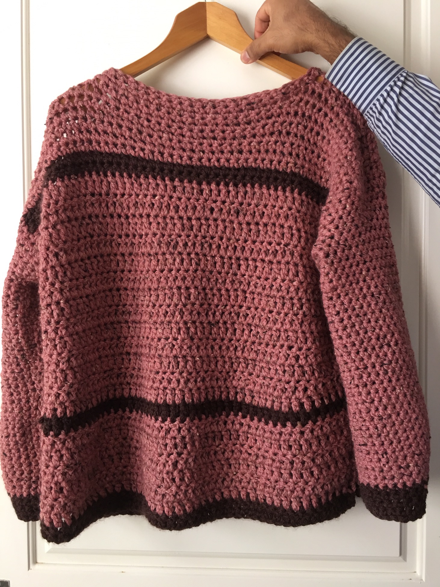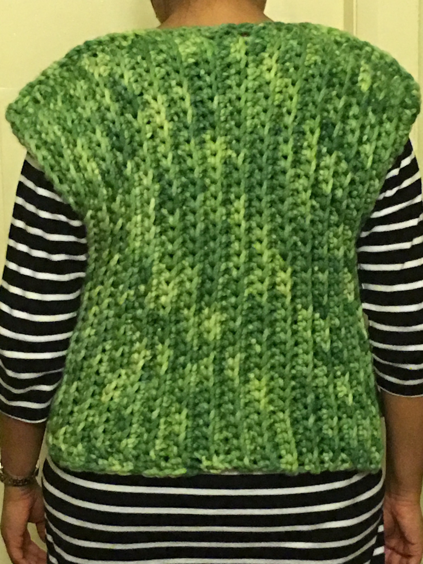 It’s a sleeveless vest, closed at the front, with practically no shaping and a simple V neck. The ribbing is a simple front post HDC. I do wear it which means it’s passed a certain test in my mind. I really enjoyed how easy it was to work with, quick to complete and yes the most important thing was that it didn’t pile when I unravelled it to rework a line. (Yes it took many unravelled goes to make it work) it’s turned out into a usable and loveable spring garment which is easy to wear.